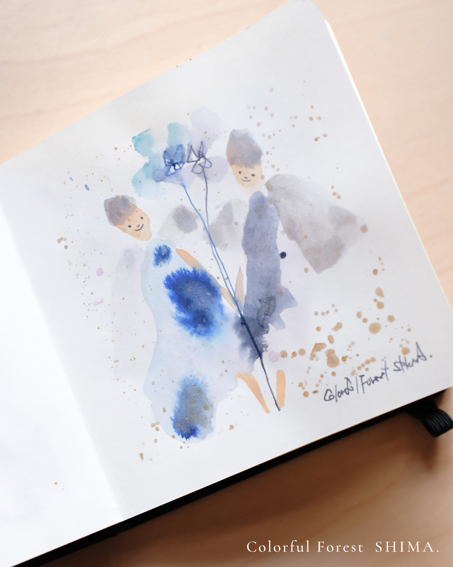 2026.03.29 朝のエスキース♯03 毎朝小さなスケッチブックにエスキース(スケッチ)を描き、作品の種を探している。 花のまわりを踊るように舞う妖精をイメージし、筆を動かした。 ーMEMOー インクや水の滲みでできた偶発的な形からうまれる、妖精のシリーズをつくろうかな。